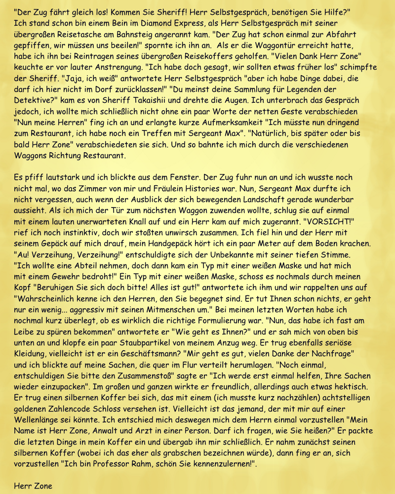 Ich gebe das Lesematerial hier zum Lesen frei, um sie mit euch zu teilen. Dabei handelt es sich um eine Geschichte, die in einer tagelangen Fahrt mit dem Diamond Express im Wilden Westen stattfindet.
