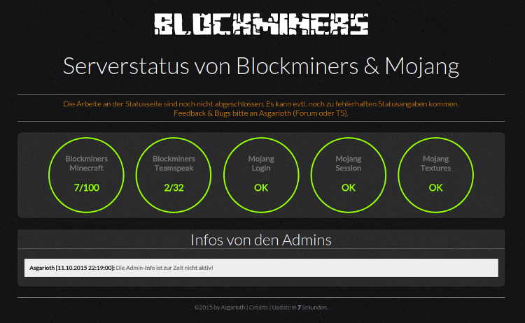 Wir haben für euch abseits von Minecraft gearbeitet und eine Statusseite für Blockminers erstellt, auf der ihr an einem Punkt alle notwendigen Informationen zum aktuellen Status von Blockminers sowie den wichtigsten Mojang-Services erhaltet.