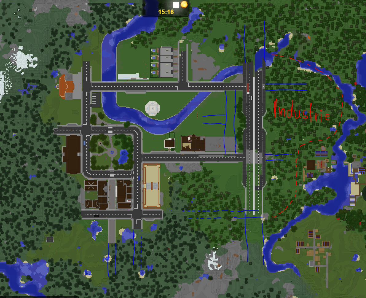 Nun zu Punkt 2, wie oben angesprochen werde ich die nächsten Wochen und Monate inaktiv(er) sein, trotzdem kann in der Stadt gebaut werden! Ich bin jeder Zeit übers Forum erreichbar. Im Moment werden vor Allem Häuser für die Innenstadt, das heißt noch einige Altstadt Geschäfts- und Wohnhäuser, sowie auch moderne Bürogebäude benötigt. Ein Platz für das Industriegebiet ist mittlerweile auch gefunden, dieses soll östlich der Autobahn entstehen, allerdings wird dort erst jede Menge Terraforming nötig sein um bauen zu können.
