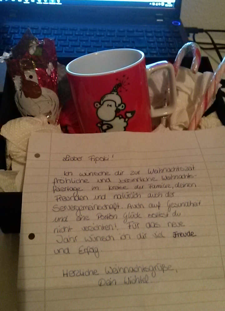 Ich verstehe ja, dass gerade die Weihnachtszeit stressig ist, und leider hatten wohl auch nicht alle Teilnehmer ihr Wichtelgeschenk pünktlich zum geplanten Gemeinsamen Auspacken - doch zumindest ein wenig Feedback, gerade auf die Auspackrunde bezogen, hätte ich mir doch sehr gewünscht, Geschenk nun schon da oder nicht. So sah es in meinen Augen eher aus, als hätte man kein Interesse mehr am Wichteln gehabt.