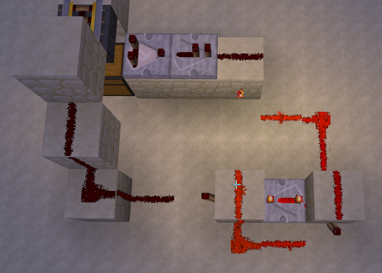 Die kleine Redstoneschaltung, die auf beiden Bildern zu sehen ist, ist ein Signalverkürzer, um zu verhindern, dass die Kistenlore ständig zwischen den beiden Stationen hin und her pendelt. Würde man die Beschleunigerschiene am Anfang/Ende der Strecke direkt mit dem Komparator verbinden, würde die Beschleunigungsschiene zwar zum Befüllen/Entleeren deaktiviert werden, ansonsten allerdings permanent aktiviert sein.