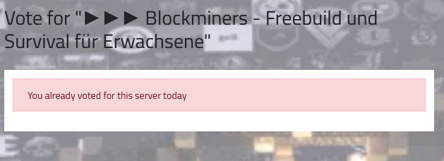 ich habe eben gerade versucht über die Homepage zu voten, aber als ich meinen Ingame-Namen eingegeben habe und den Vote bestätigen wollte, wurde mir angezeigt, dass ich heute nicht mehr voten kann. Als ich aber auf den Minecraft-Server online gekommen bin und über /vote den Link zum Voten aufgerufen und dort versucht habe zu voten, hat es auf einmal geklappt.