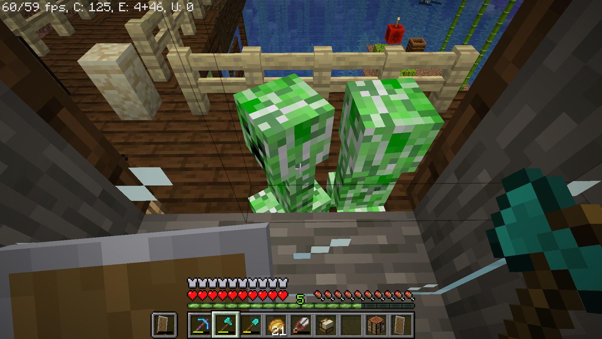 Meine zahlreichen Besucher von früher schon an meinem Fenster, sowie die Creeperrate auf dem Blockminers GS wohl gemerkt nur 2 Blöcke Platz bis zum Zaun. Aber ist wie mit Partys, egal wie klein die Küche ist, da passen die meisten Gäste rein xD