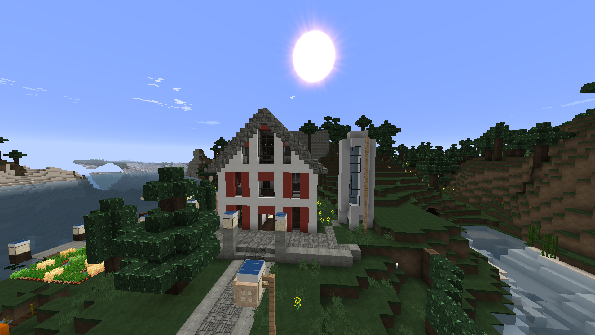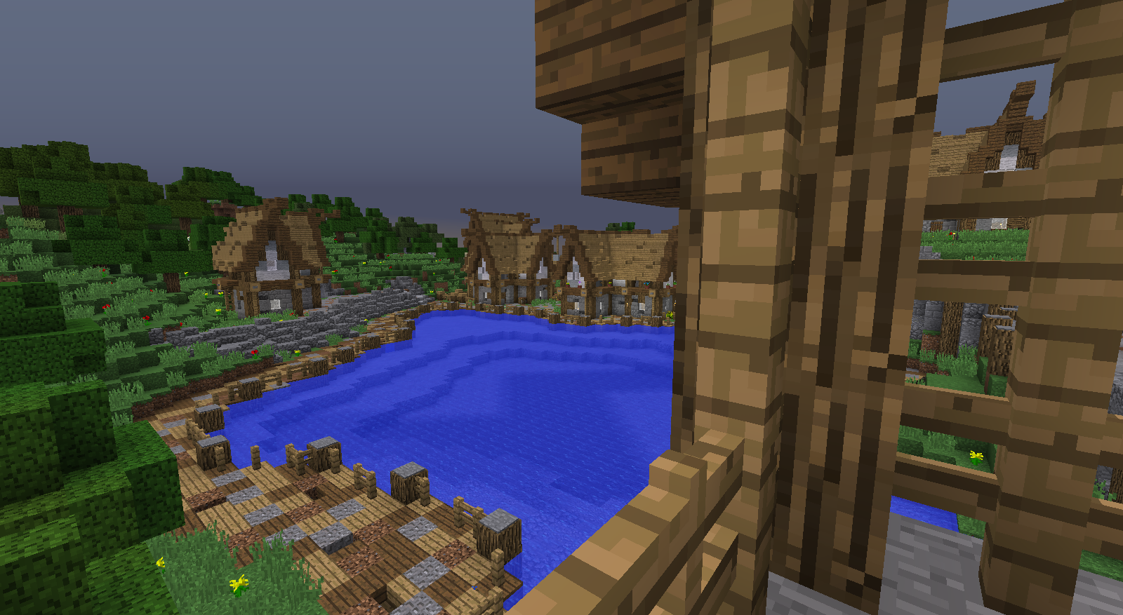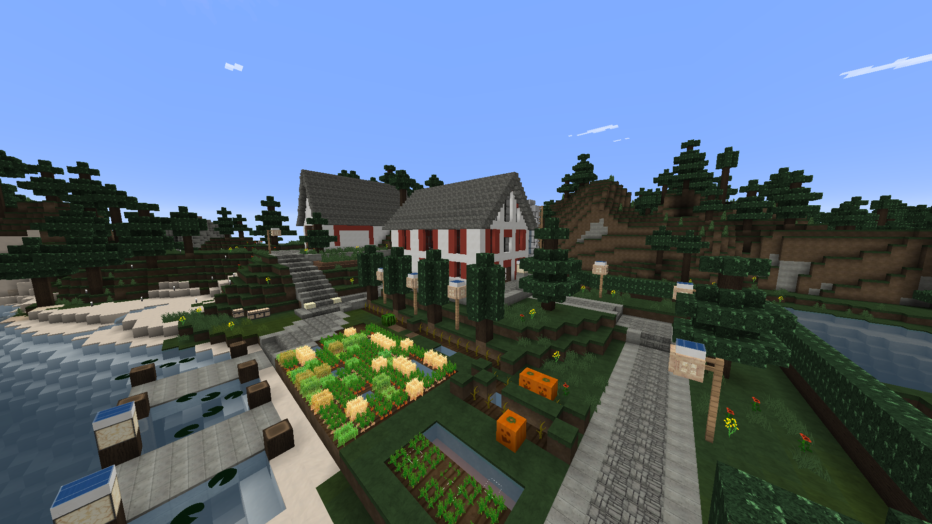 Wir haben derzeit 8 Häuser, einen Wachturm, einen See in der Mitte des Dorfes, eine Farm, eine Goldmine und eine Schweinezucht, alles mit Details verziert und durch ein aufwendiges Straßennetz verbunden Smile Alle Häuser sind eingerichtet und die meisten davon werden auch aktiv benutzt, also z.B. als Schmiede, Lager, Farm, usw.