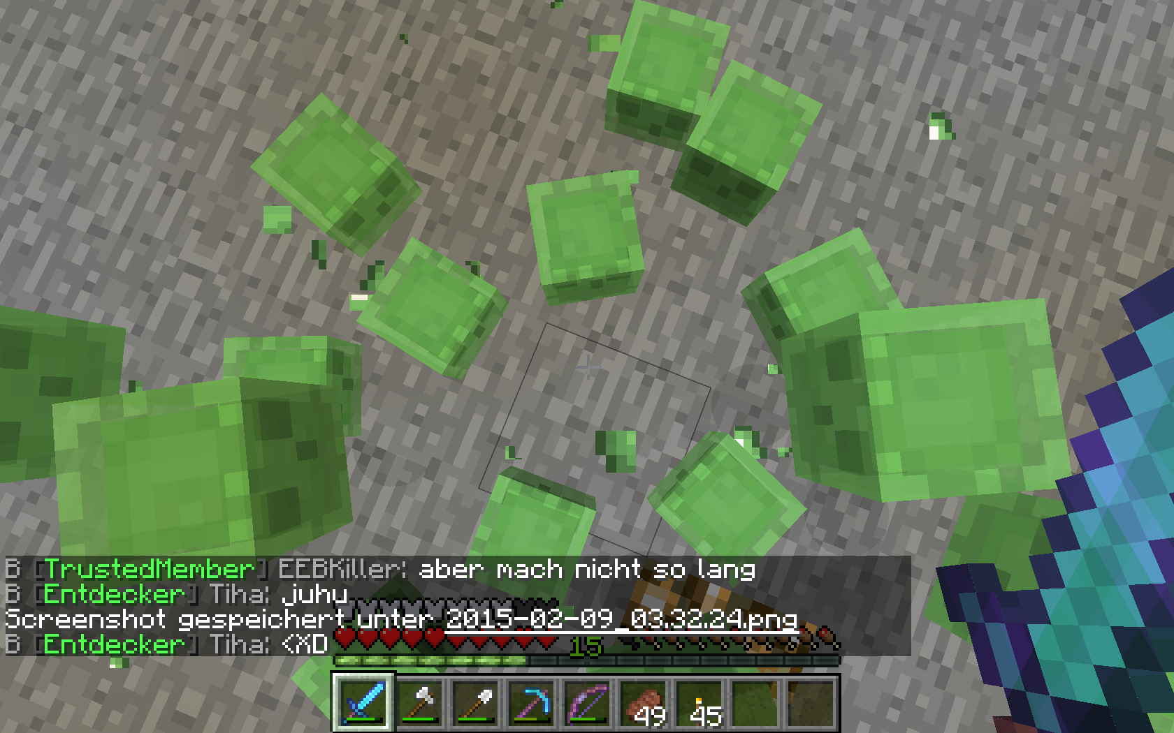 jetzt hab ich fast alle wichtigen sachen wieder die ich verloren habe. fehlt eigendlich nurnoch meine tolle spitzhacke und mein stack slimebälle :3