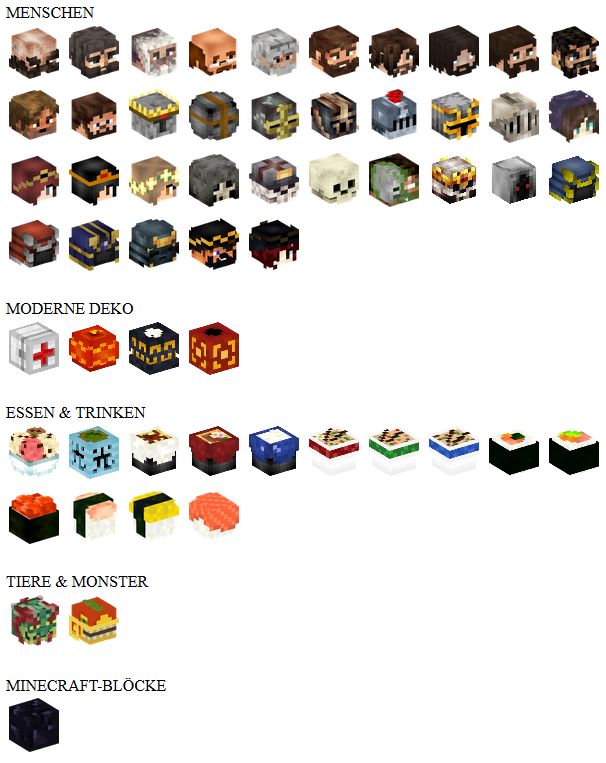 - Neue Sektion: Menschen - dort sind menschliche Köpfe zu finden die vor allem mit der Permission Edit Armor Stands für Figuren verwendet werden können um die Bauten noch zu beleben.