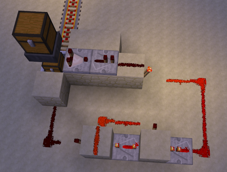 Die kleine Redstoneschaltung, die auf beiden Bildern zu sehen ist, ist ein Signalverkürzer, um zu verhindern, dass die Kistenlore ständig zwischen den beiden Stationen hin und her pendelt. Würde man die Beschleunigerschiene am Anfang/Ende der Strecke direkt mit dem Komparator verbinden, würde die Beschleunigungsschiene zwar zum Befüllen/Entleeren deaktiviert werden, ansonsten allerdings permanent aktiviert sein.