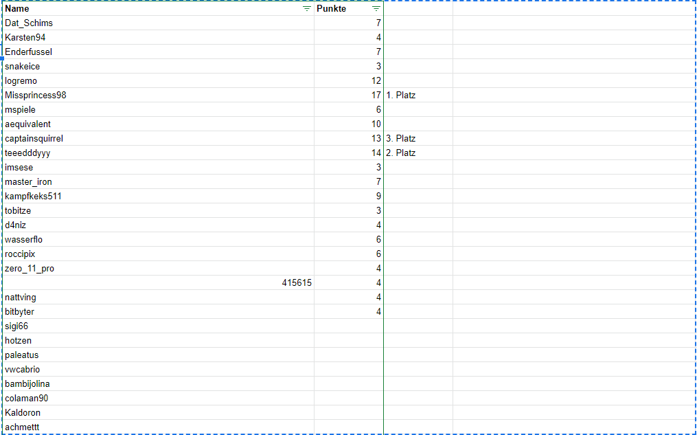 Für alle hier nochmal die Übersicht der Punkte und die komplette Teilnehmerliste