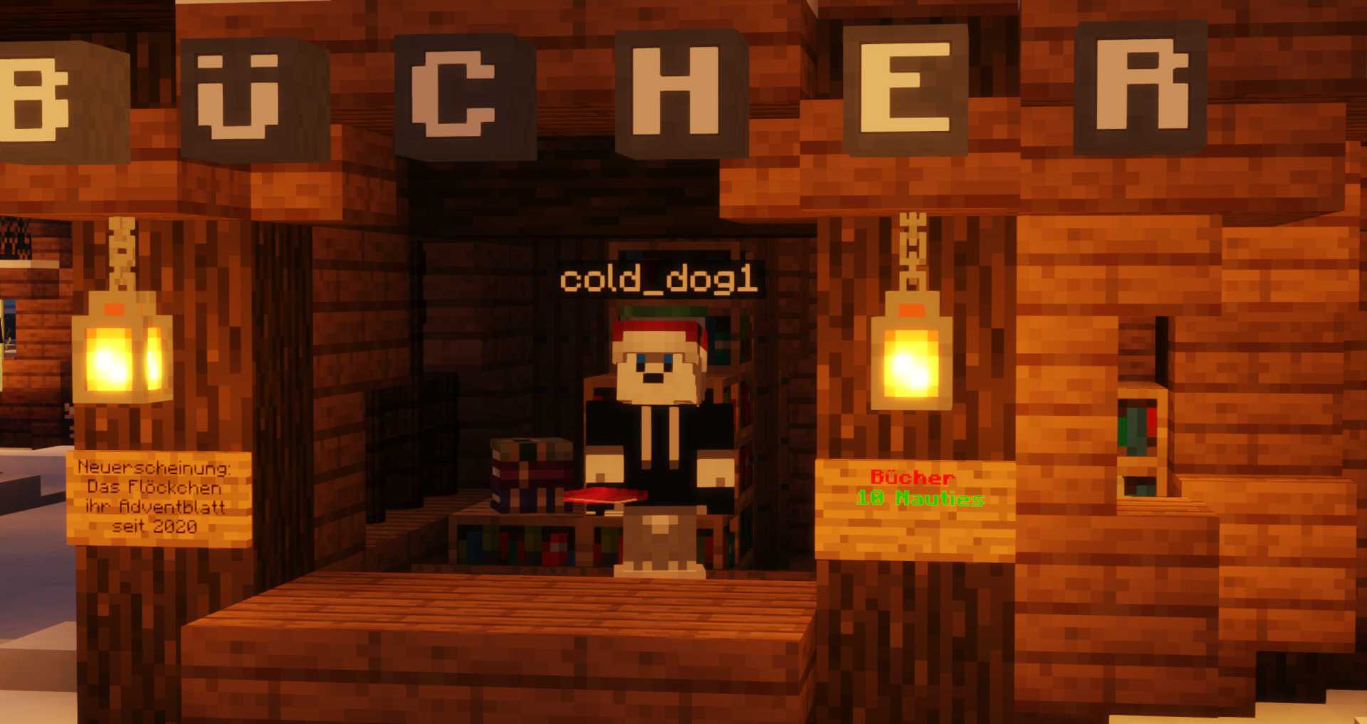 Der Weihnachtshund freut sich also auf eure Briefe. Natürlich in Minecraft. Dafür braucht ihr Buch und Feder (Book and Quill). Ihr könnt darin alles schreiben, was euch so einfällt. Ob Gedichte oder Geschichten, Verrücktes, Weihnachtliches, Sachliches oder als klassischer Wunschzettel formuliert, ob wortkarg oder romanartig - der Weihnachtshund wird jeden Brief lesen und beantworten. Egal, in welchem Stil ihr den Brief schreibt, wenn ihr Wünsche habt, äußert sie bitte im Buch.