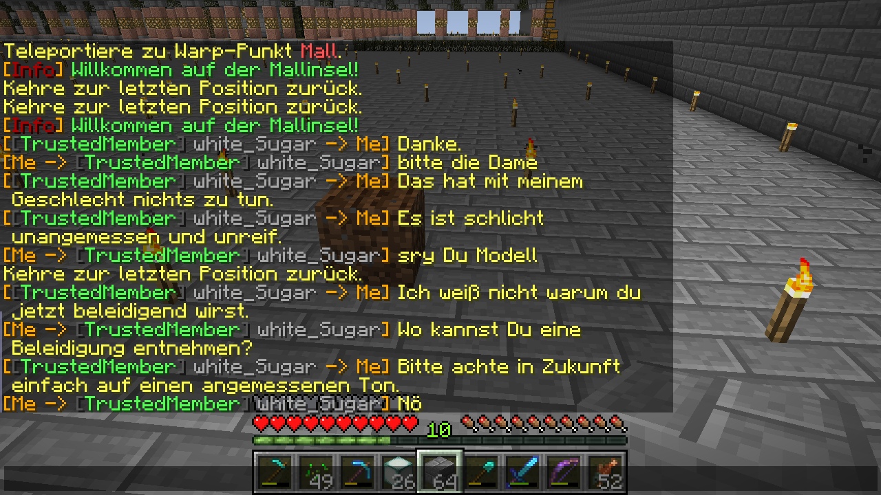 Die Zeit, das ganze bauen, die friedlichen Kontakte mit dennen man zusammen gebaut hat.. All das wird so gehandhabt wegen so einer Kleinigkeit die ich auch noch klären wollte? Hätte da nicht mal ein Mod kommen können und den "Streit" im besten Fall schlichten können damit auf dem Server harmonie herscht? Stattdessen wird eiskalt gebannt?